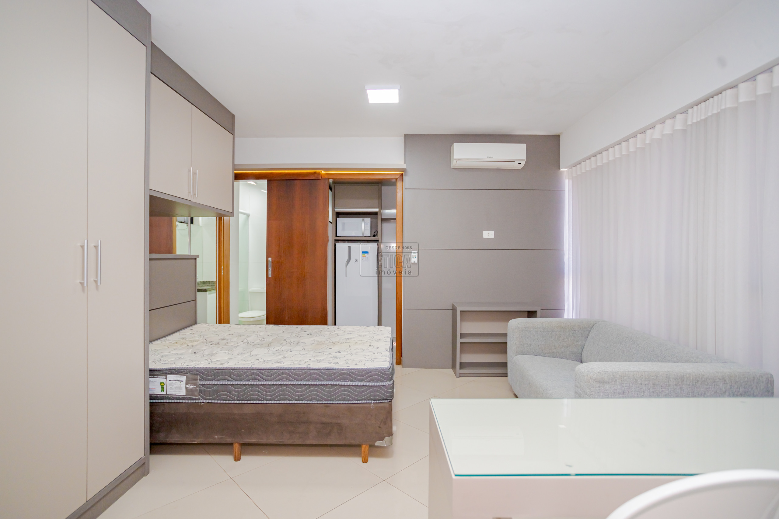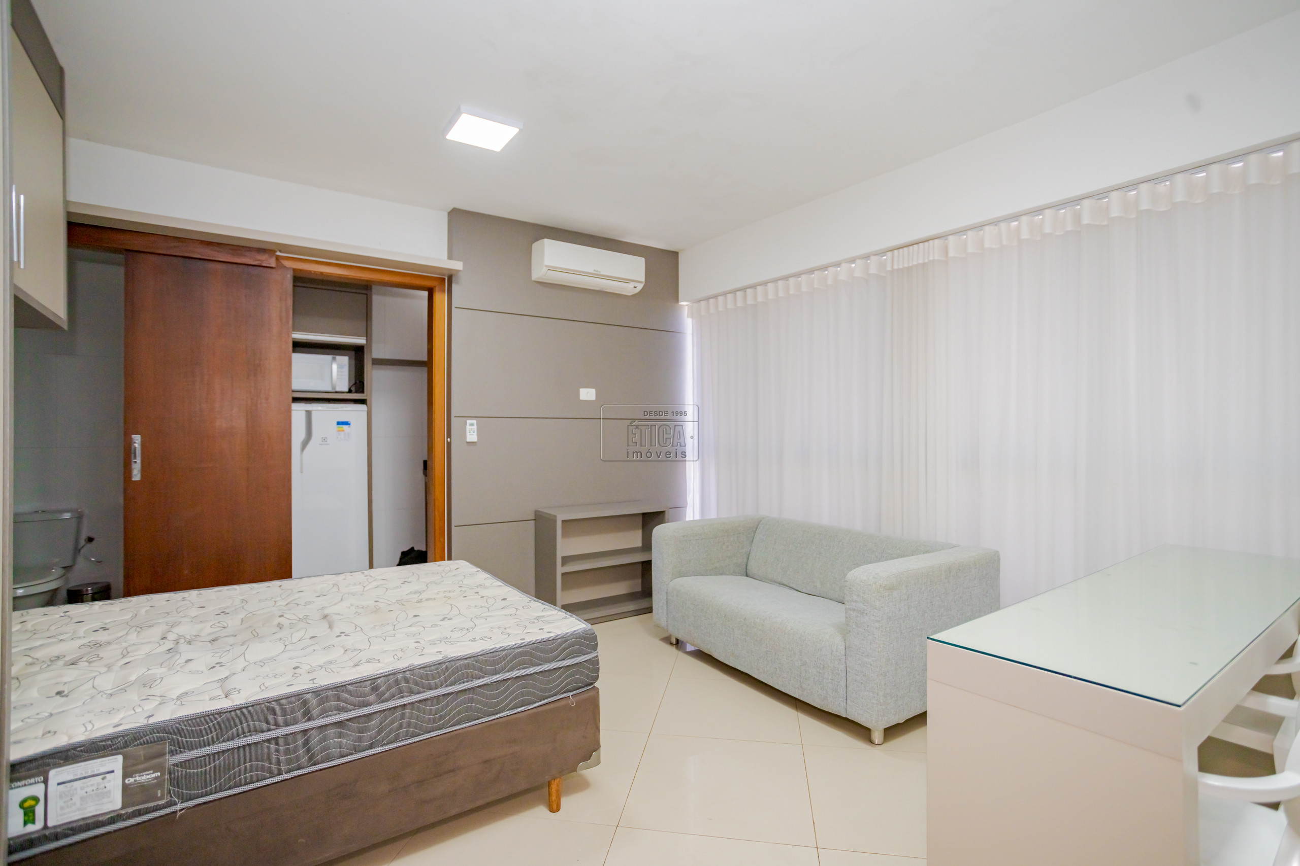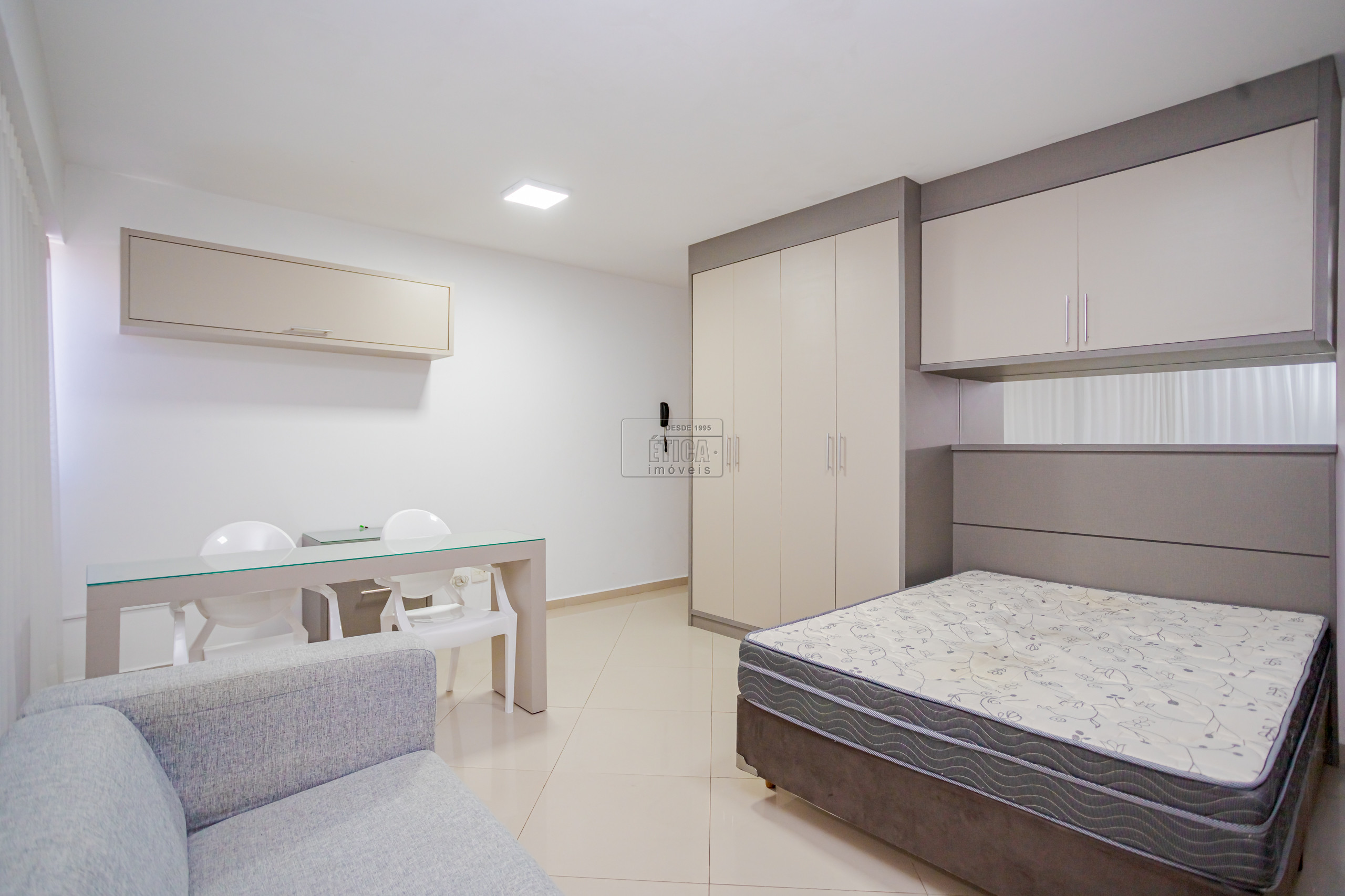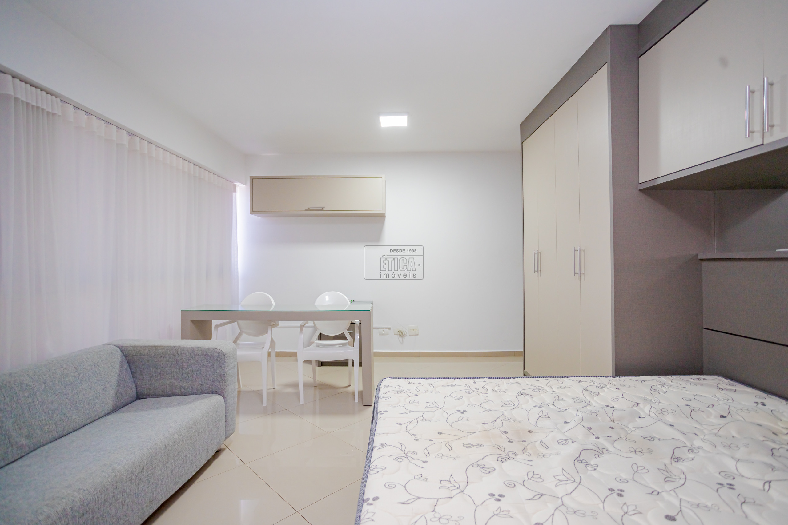 Studio no ultimo andar com belíssima vista, armários sob medida, cozinha com armários, cooktop, geladeira, micro-ondas e 1 banheiro.