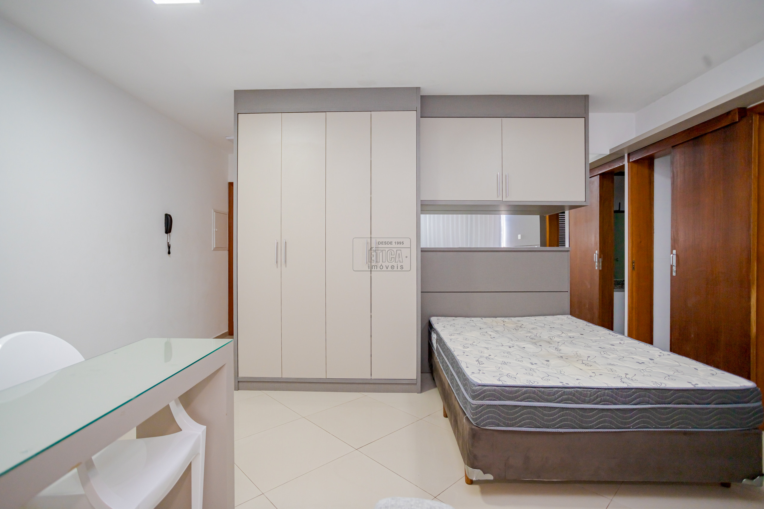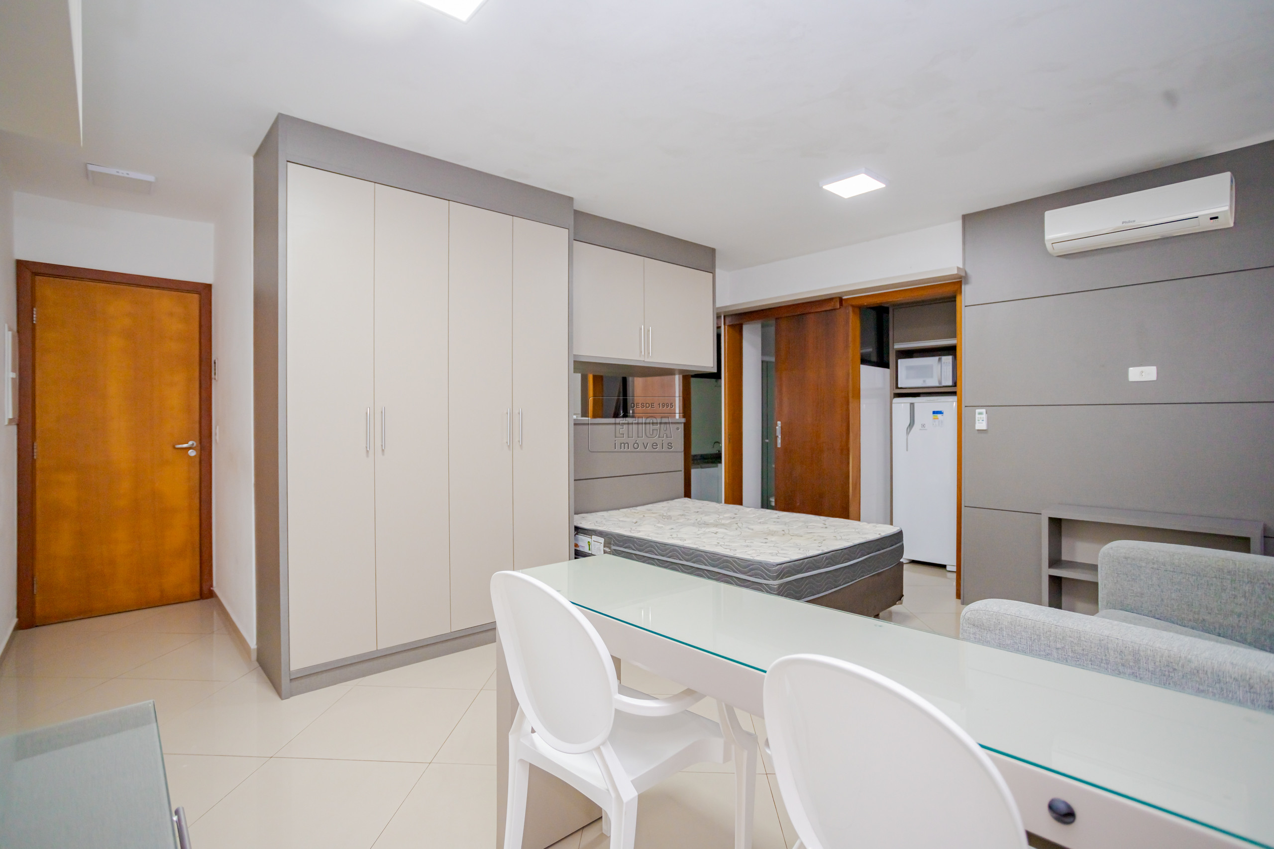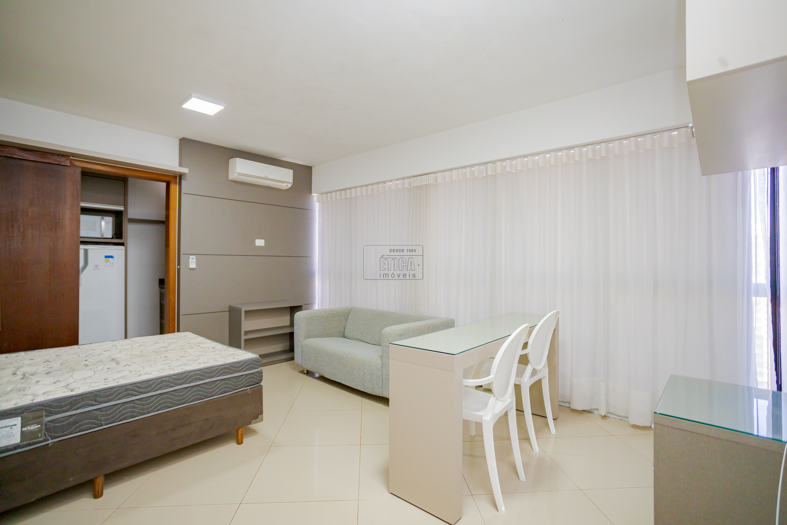 Studio no ultimo andar com belíssima vista, armários sob medida, cozinha com armários, cooktop, geladeira, micro-ondas e 1 banheiro.