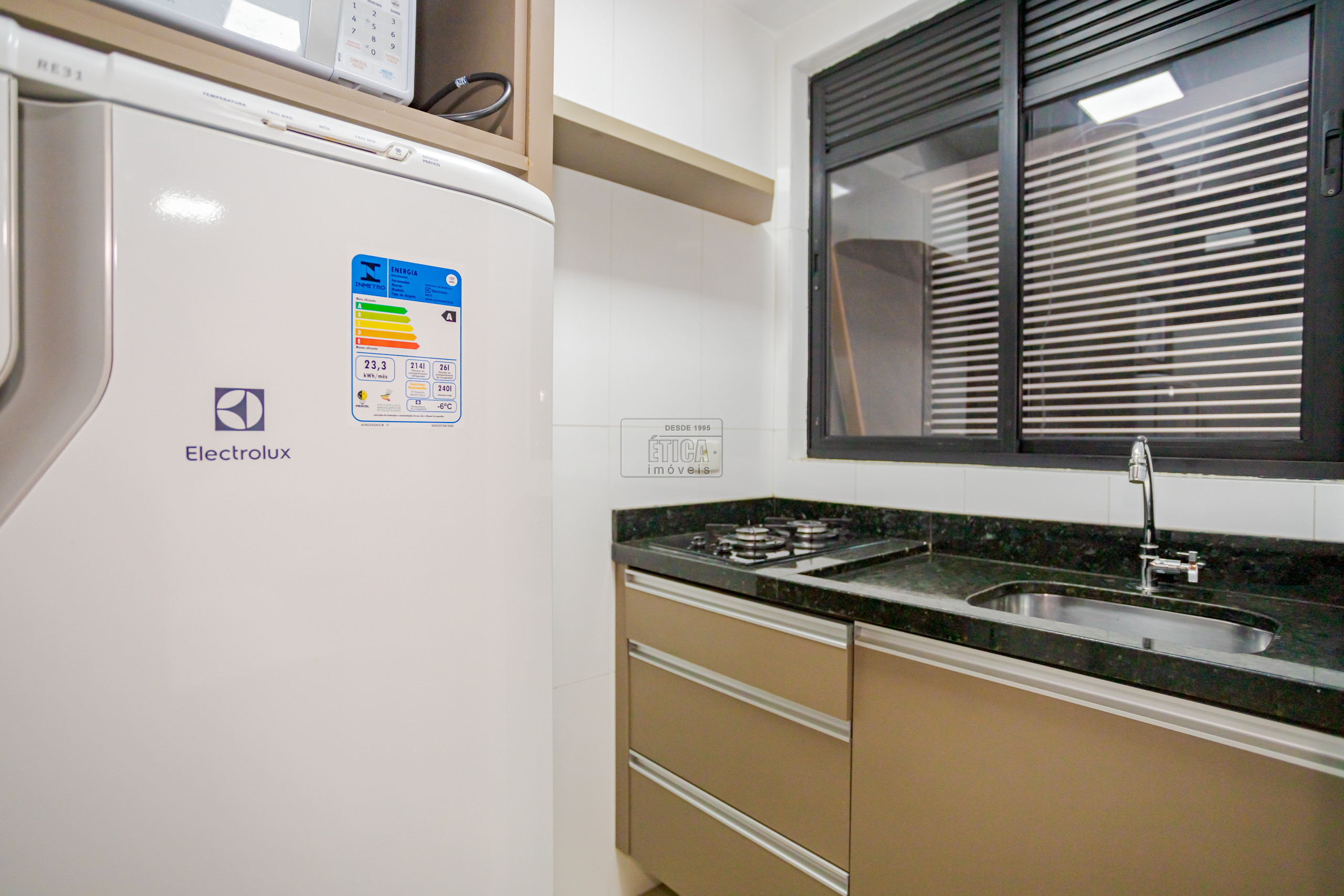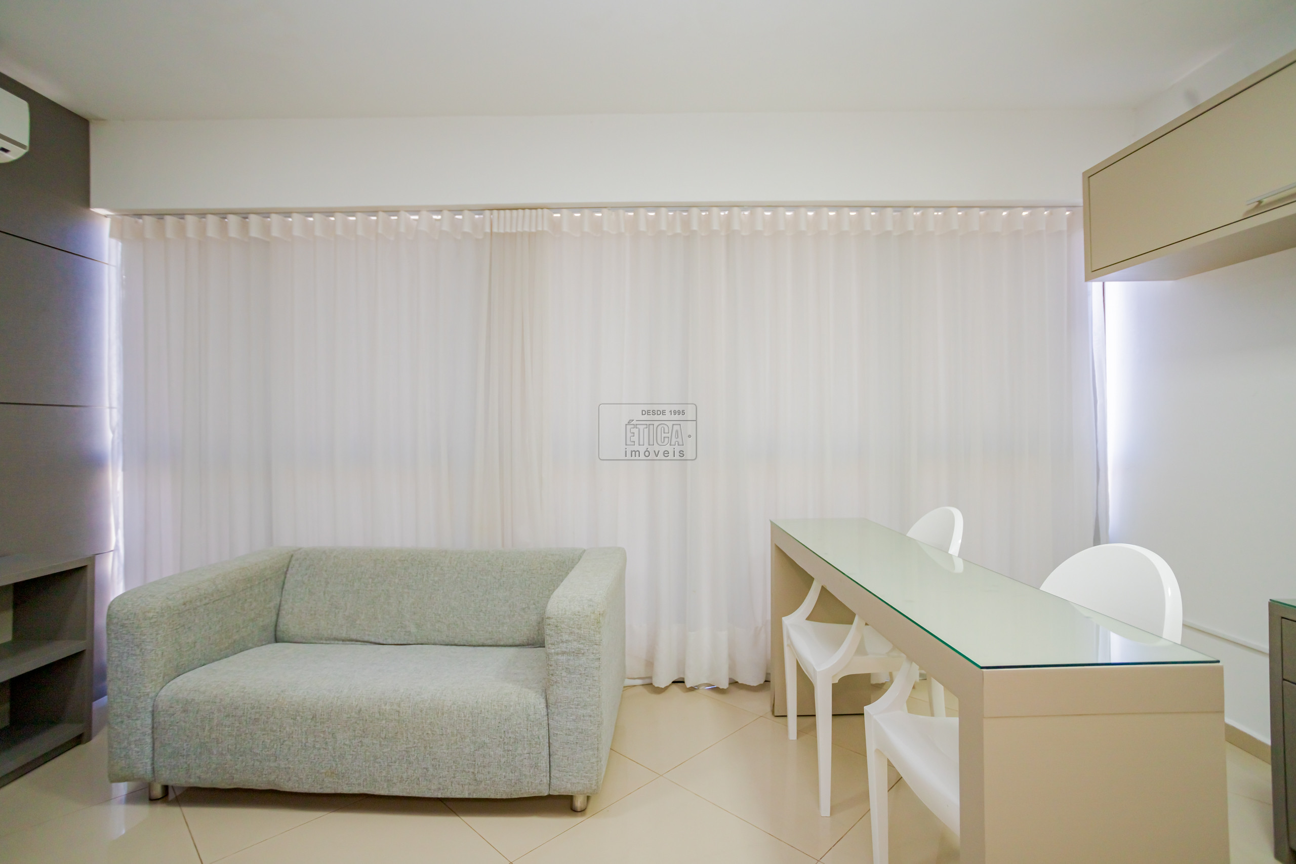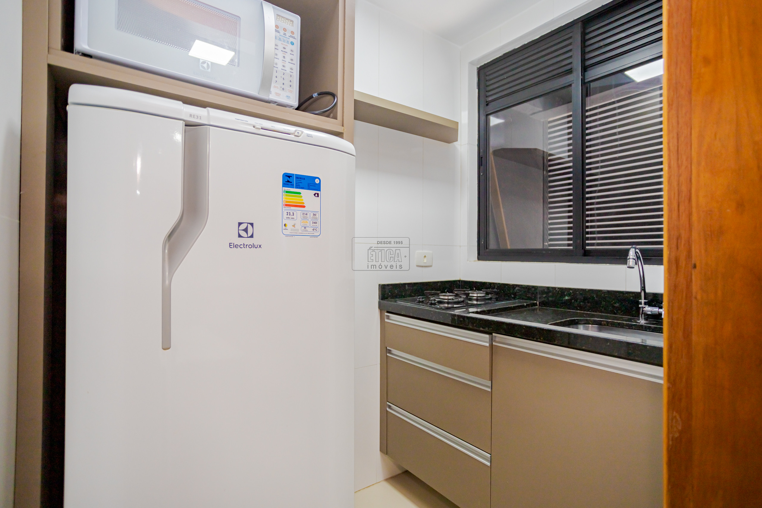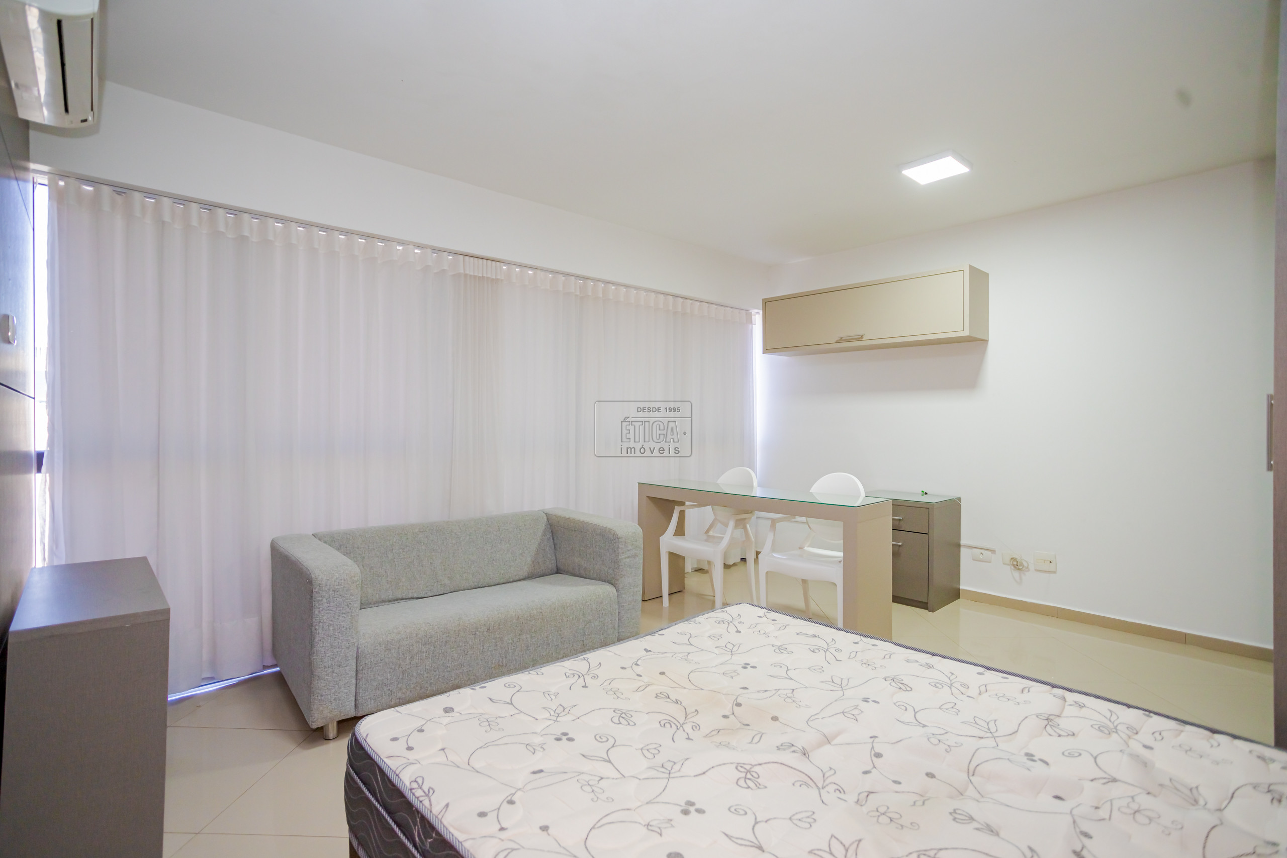 Studio no ultimo andar com belíssima vista, armários sob medida, cozinha com armários, cooktop, geladeira, micro-ondas e 1 banheiro.